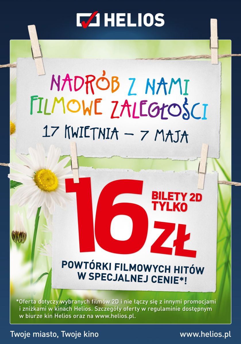 Ogólnopolska sieć kin Helios wychodzi naprzeciw wszystkim Widzom i dla każdego szykuje coś wyjątkowego. Pomysł na nadrabianie filmowych zaległości zrodził się ze świadomości, że wielu miłośników kina na co dzień nie zawsze ma czas, aby obejrzeć upragniony film. Dlatego też z chęcią umożliwimy "nadgonienie" filmowych zaległości tym, których ominęły premiery ostatnich miesięcy.