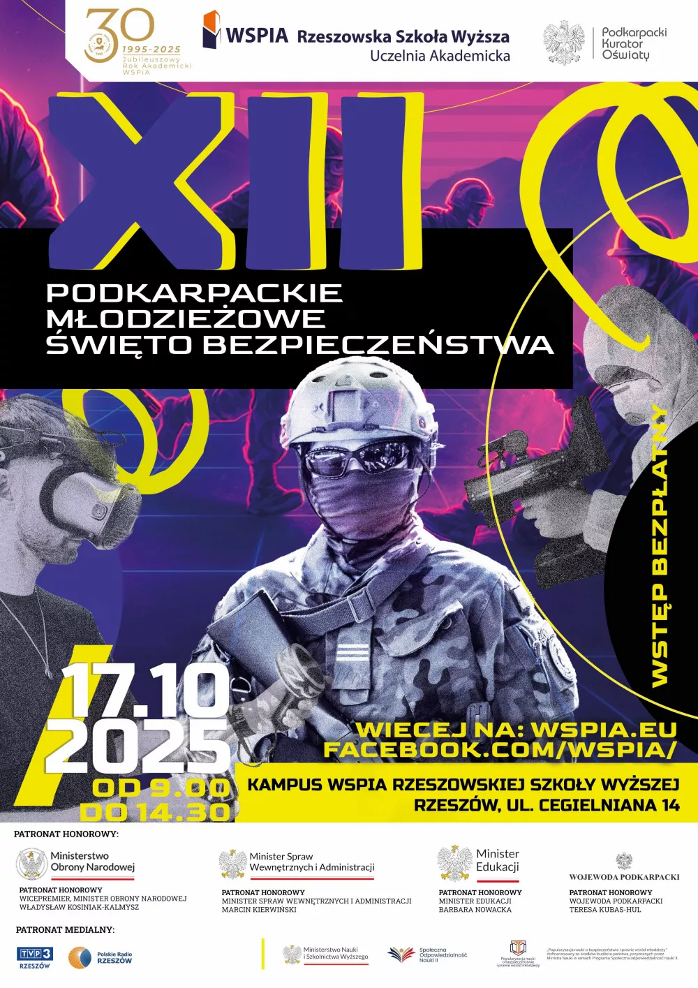 Już 17 października 2025 r. kampus WSPiA Rzeszowskiej Szkoły Wyższej przy ul. Cegielnianej 14 w Rzeszowie ponownie stanie się miejscem spotkania młodzieży, służb mundurowych, ekspertów i pasjonatów bezpieczeństwa. Tego dnia odbędzie się XII Podkarpackie Młodzieżowe Święto Bezpieczeństwa – jedno z największych w regionie wydarzeń edukacyjno-promocyjnych poświęconych szeroko rozumianemu bezpieczeństwu publicznemu.